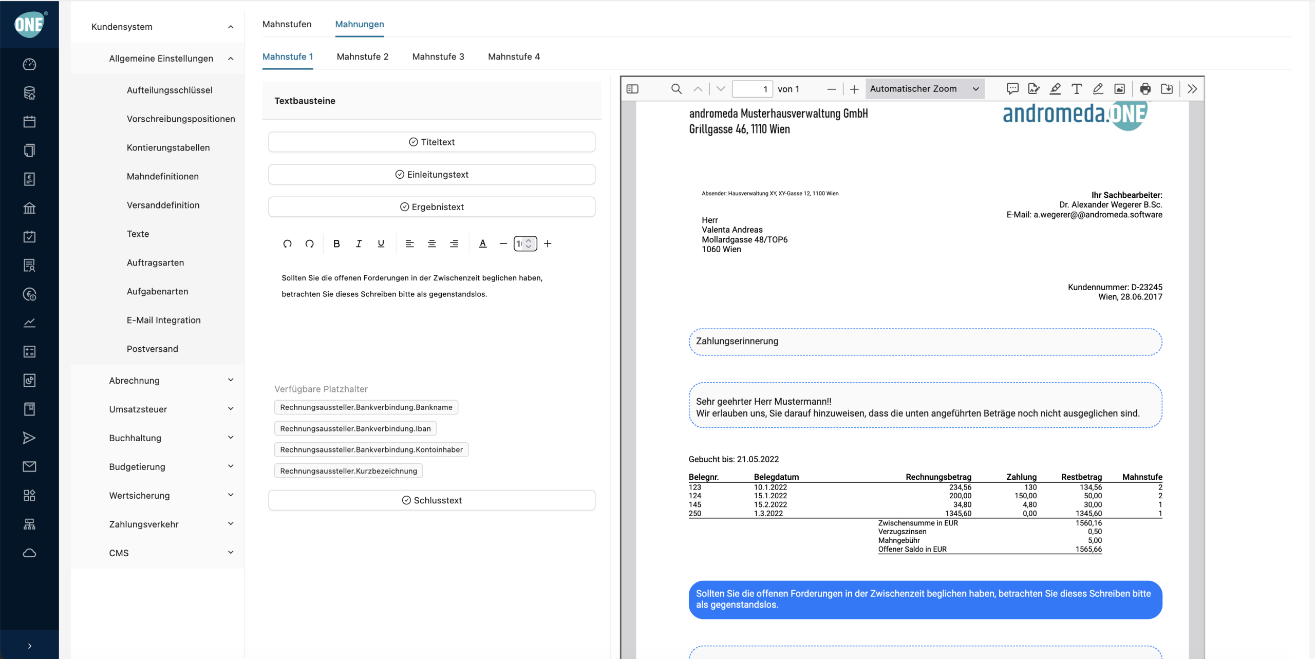 - Automatische Verbuchung Einnahmen & Mahnwesen: Ja – automatisiertes Mahnwesen mit E-Mail-Versand und automatischer Buchung von Gebühren und Zinsen; Zahlungsverkehr vollständig via EBICS integriert.