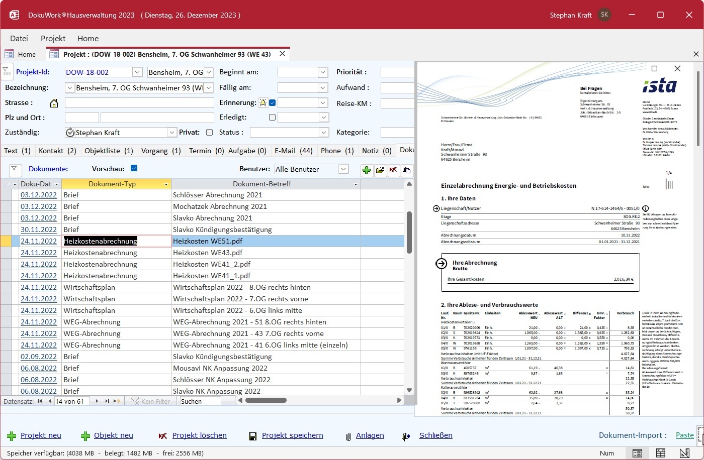 - Telefonanbindung mit Anruferkennung ist möglich. Alle Daten werden zu Objekt, Einheit und Kontakt zugeordnet. Integrierte Vorgangsverwaltung zur Abwicklung von Vorgängen (z.B. Wasserschaden). Integrierte Fakturierung für Hausmeister-Rechnungslegung. Integrierte Bilddatenbank.
