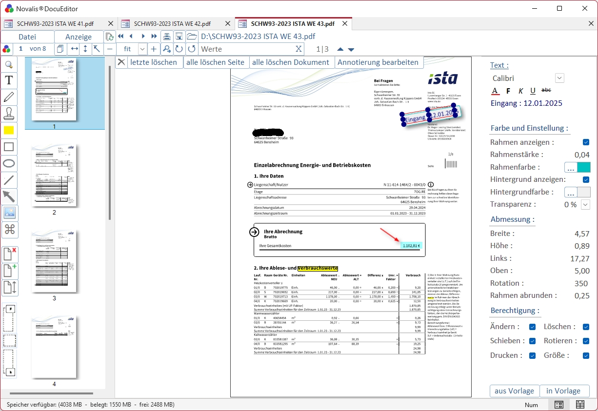 - Für die Volldigitalisierung (Verzicht auf Papierdokumente) wird ein eigener Dokument-Editor mit ausgeliefert, der PDF-, Office- oder Grafikformate editieren und annotieren kann. Alle Dokumente aus allen Programmen (Buchhaltung, WEG-Versammlungsverwaltung) werden im CRM & DMS zusammengeführt (automatisch) und automatisiert (gesammelt) per Mail oder E-Post versendet.