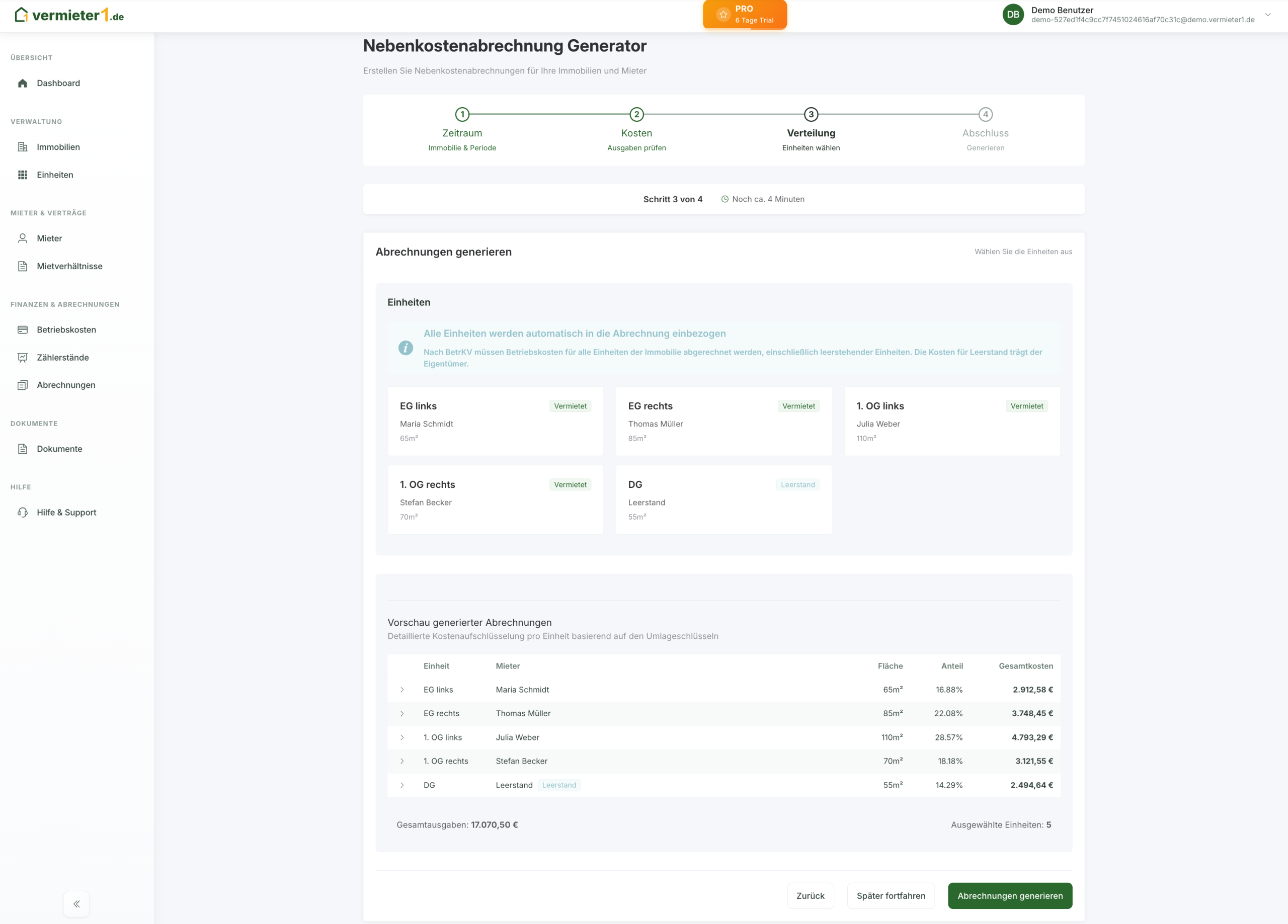 - Verteilen: Die Software kennt die korrekten Umlageschlüssel (Personen, Verbrauch).